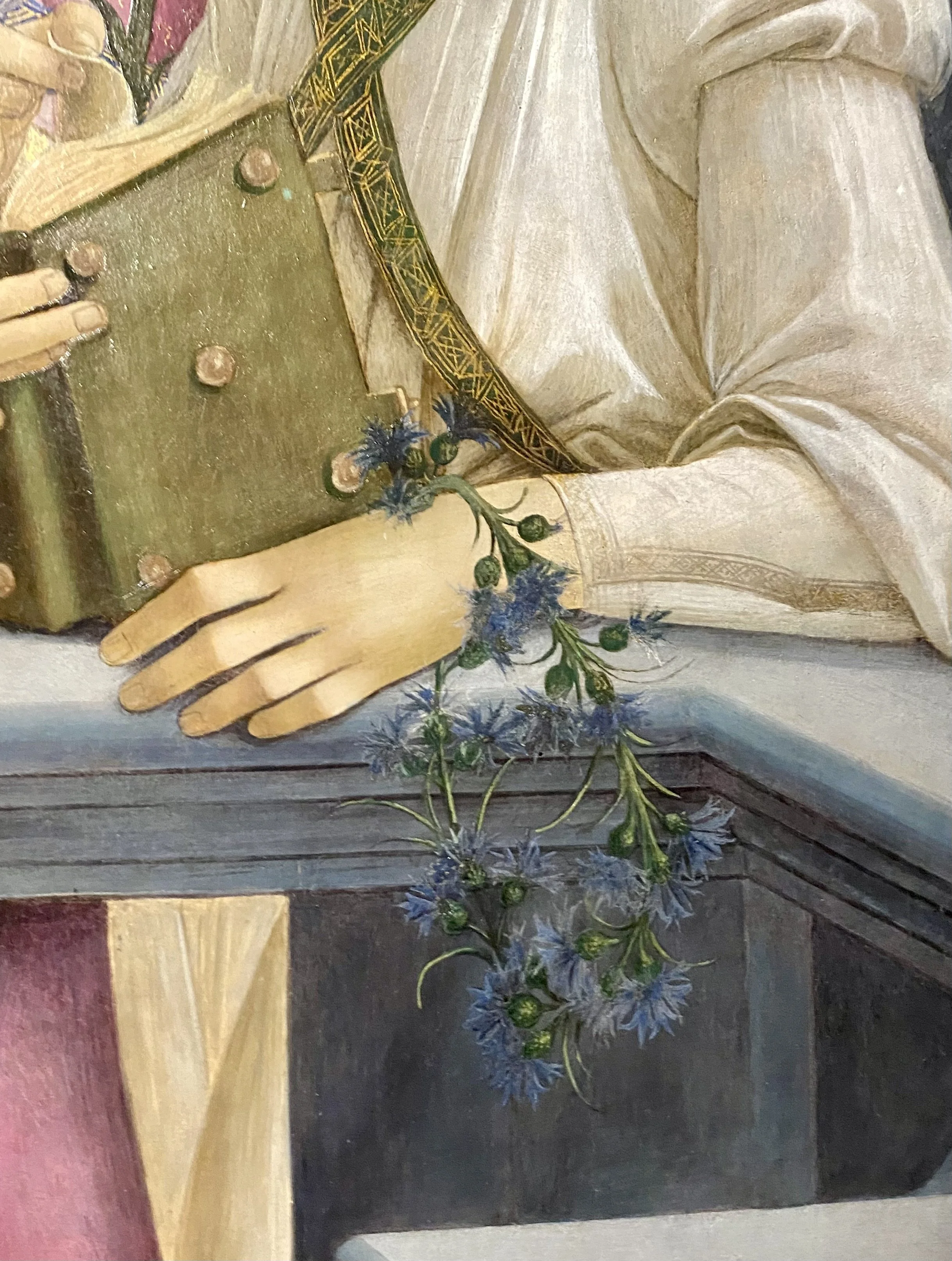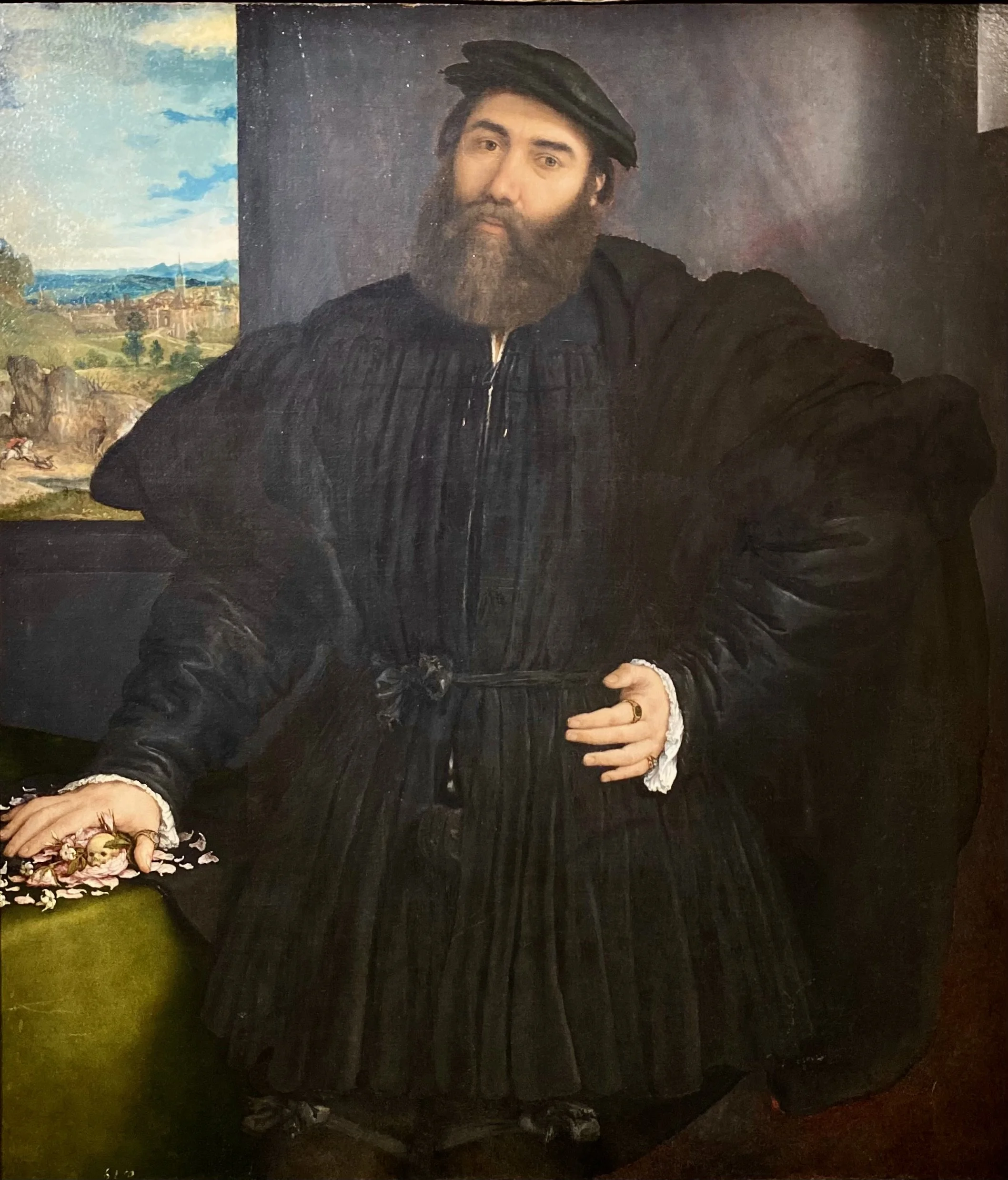 La quatrième salle tout en longueur est une galerie de portraits. Du portrait de Mercurio Bua, un condottierre (capitaine de mercenaires), émane une mélancolie très émouvante. Plutôt que de se présenter de façon agressive et conquérante, l’homme porte un élégant costume noir évoquant le deuil. En se penchant sur les détails de la peinture, on peut apercevoir deux alliances à son doigts, qui symbolisent ses deux épouses défuntes. Le pauvre Mercurio en plus d’être deux fois veuf avait également perdu un fils encore nourrisson, dont le souvenir est évoqué par le petit crâne entouré de pétales de rose et de jasmin sur lequel il pose sa main. Cette petite nature morte symbolique est un «memento mori», destiné à rappeler à l’Homme la fragilité de l’existence. Une telle vulnérabilité assumée chez un chef de guerre rend à mon sens l’œuvre particulièrement digne d’intérêt.