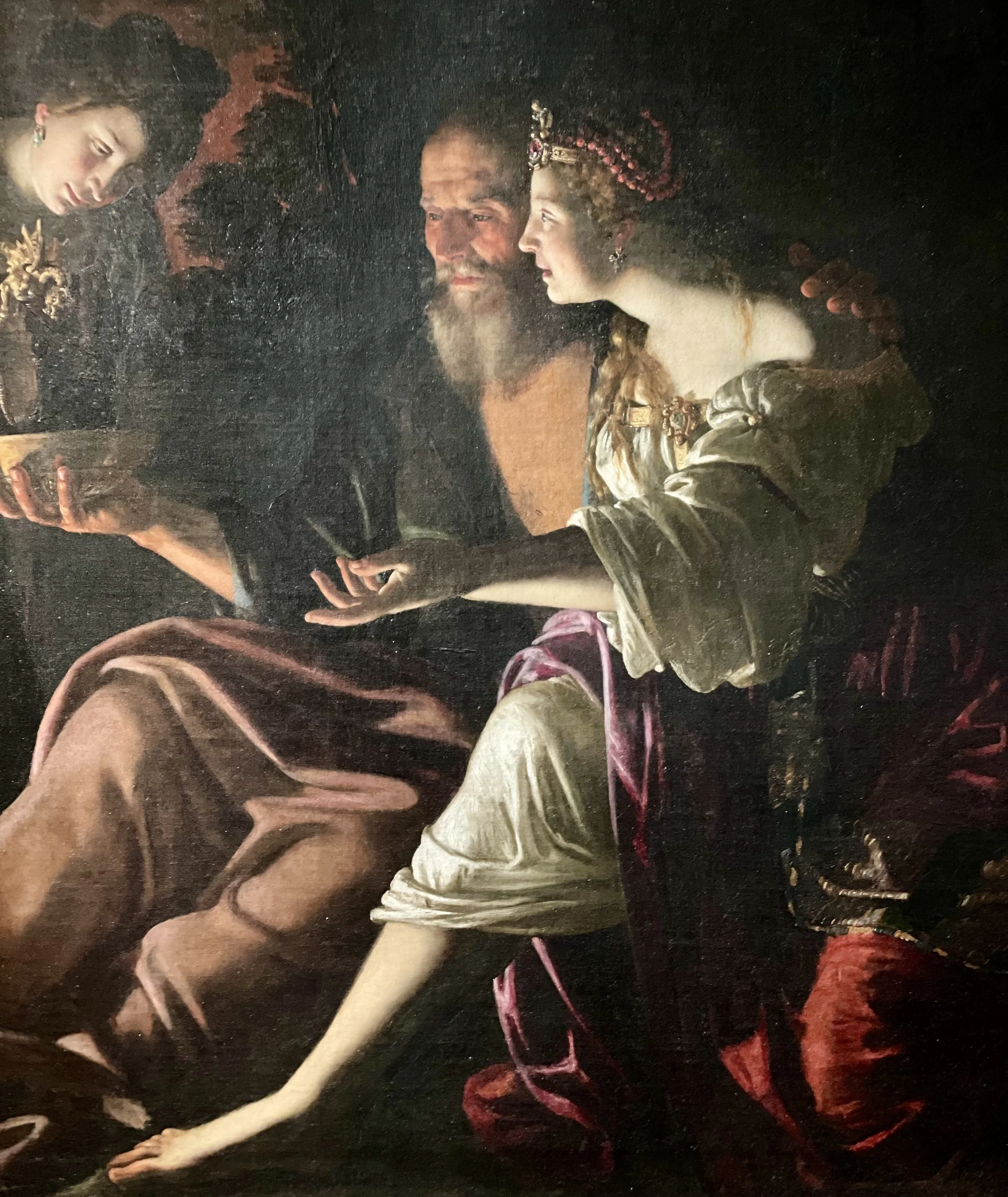 Un autre tableau m’interpelle cependant : «Loth et ses filles» de l’artiste Giovanni Francesco Guerrieri (1617). Sur cette composition, les filles de Loth l’enivrent avant de s’unir à lui pour perpétuer la race humaine, suite à la chute de Sodome et Gomorrhe. Malgré un sujet moins que réjouissant, cette peinture de grandes dimensions nous envoûte : le clair-obscur caravagesque nous fait ressentir l’aura de désespoir qui entoure cette famille exilée. Dans la pénombre, on pressent, frissonnant, l’horreur imminente. Les figures délicates sont éclairées, les ornements des deux femmes et la carafe dorée resplendissent, comme tout autant de détails qui annoncent la suite terrifiante qui attend les personnages.