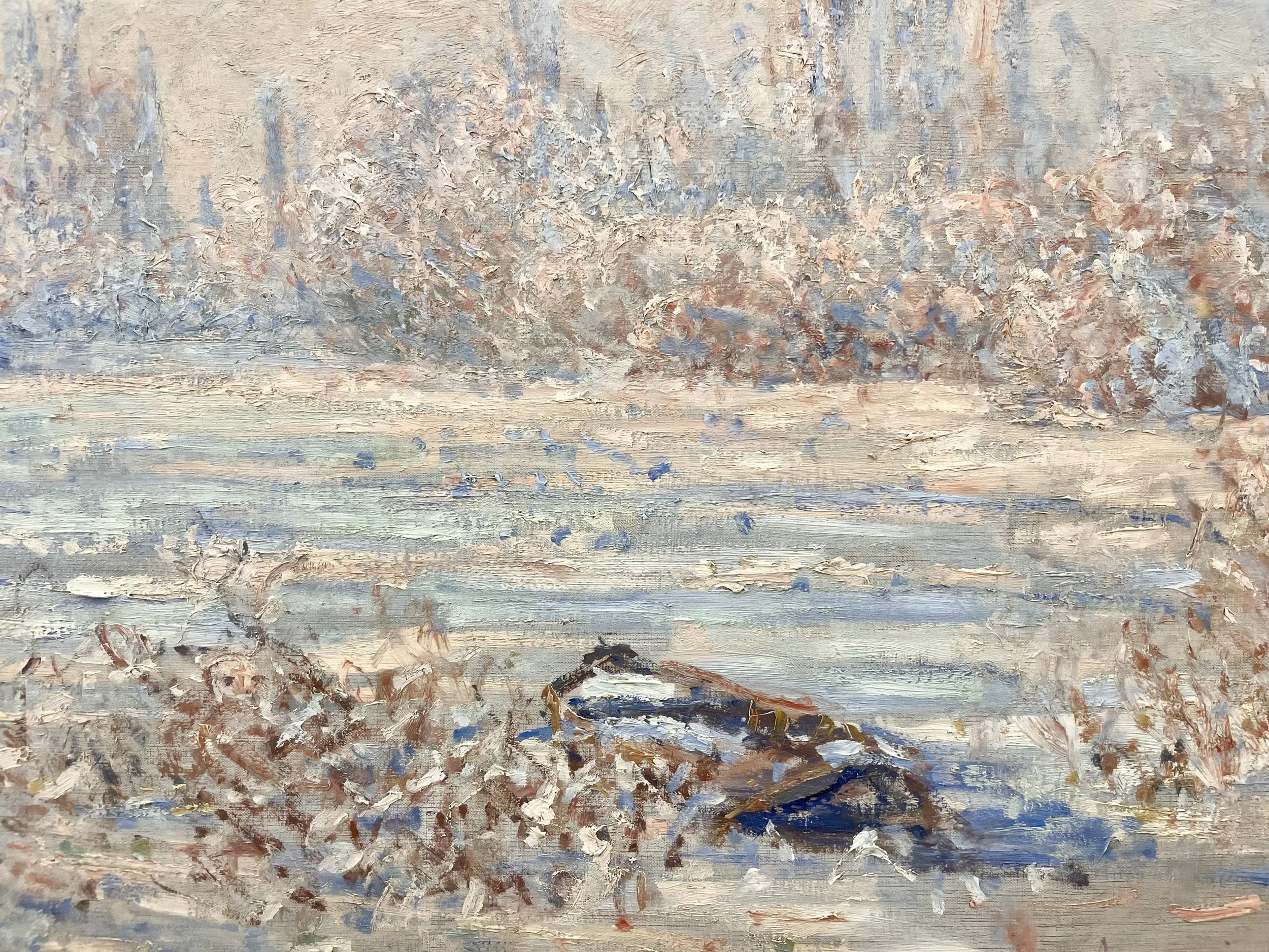 Les paysages de neige sont également à l’honneur. L’artiste doit repousser ses limites, aussi bien physiques en bravant le froid que visuelles en restituant les reflets du soleil sur le paysage enneigé de façon novatrice. Pour Monet, le défi culmine autour de 1879-1880 à Vétheuil, alors qu’un hiver particulièrement rigoureux fait geler la seine et lui arrache sa femme, Camille. Avec « le Givre » Monet crée un paysage boréal, parant la neige de teintes rose et bleues presque fantastiques.